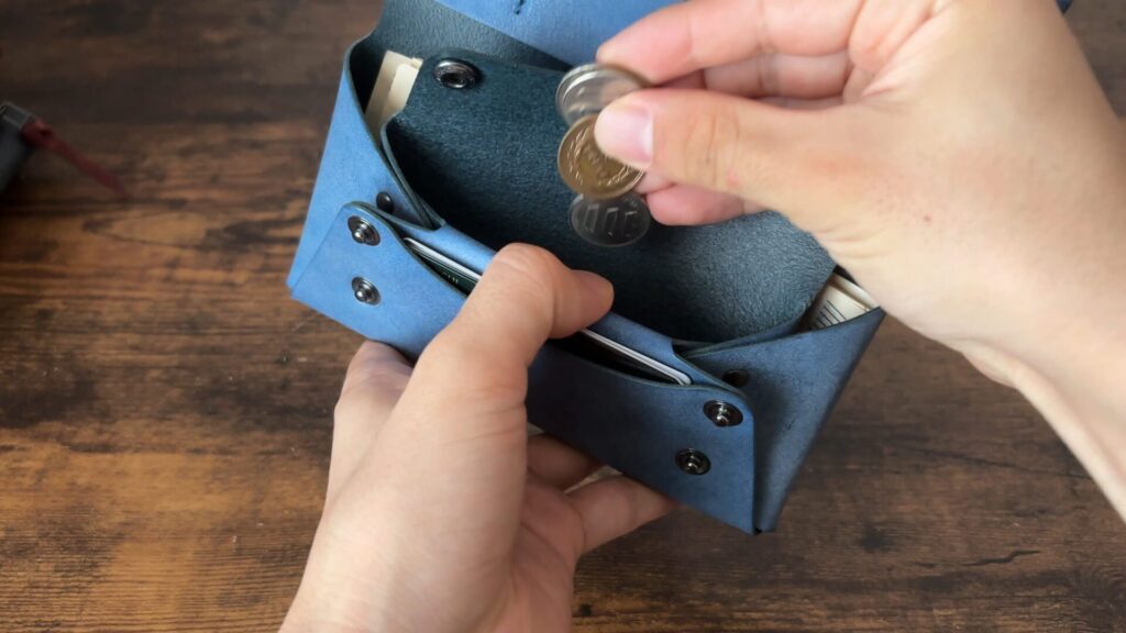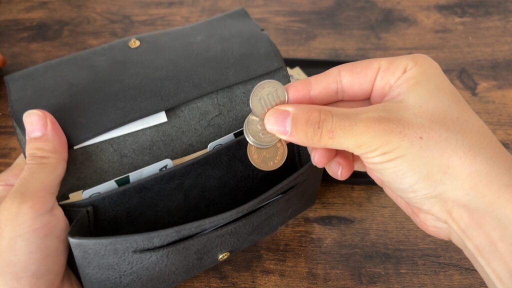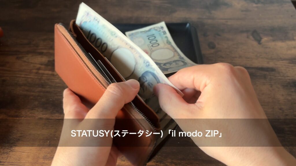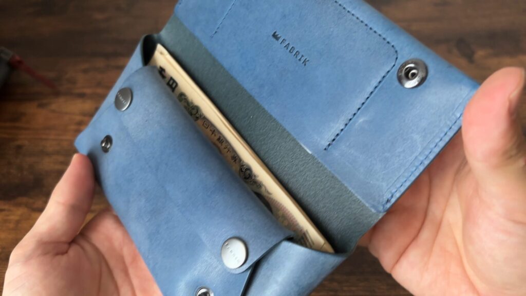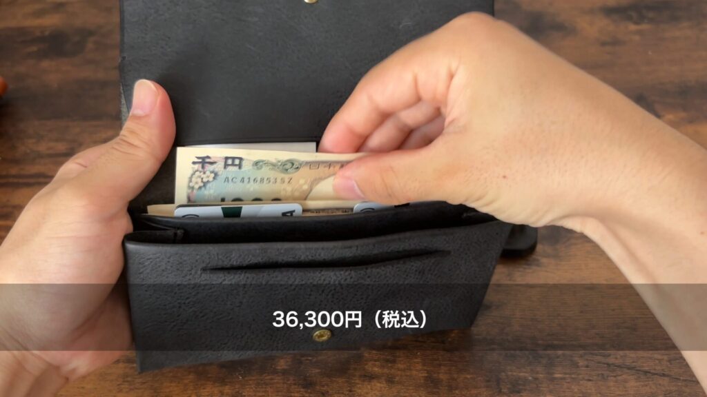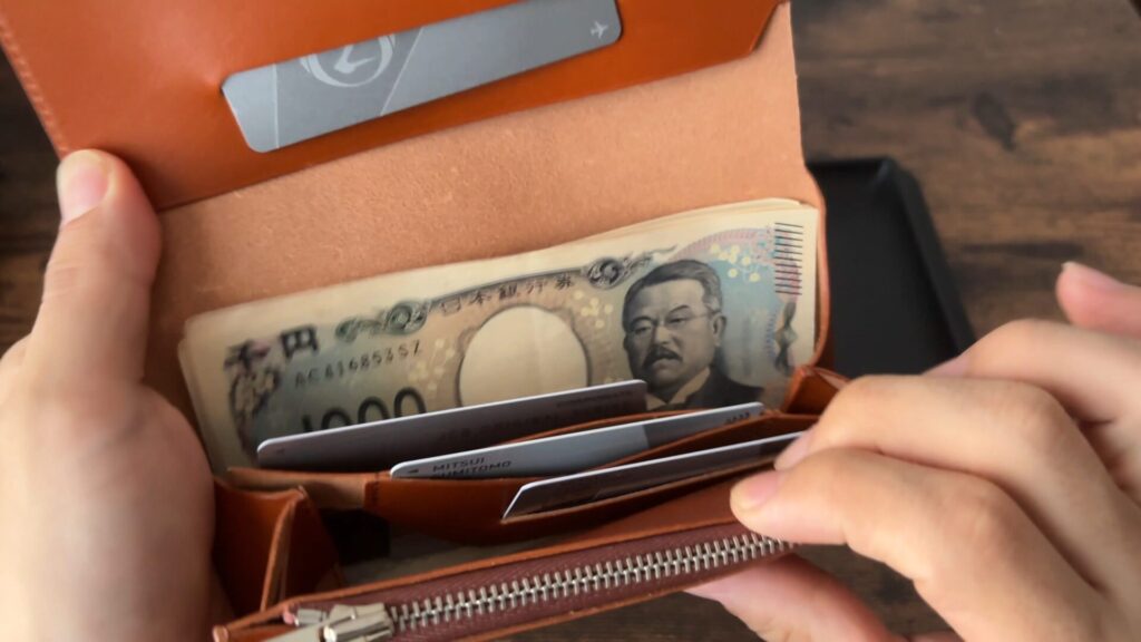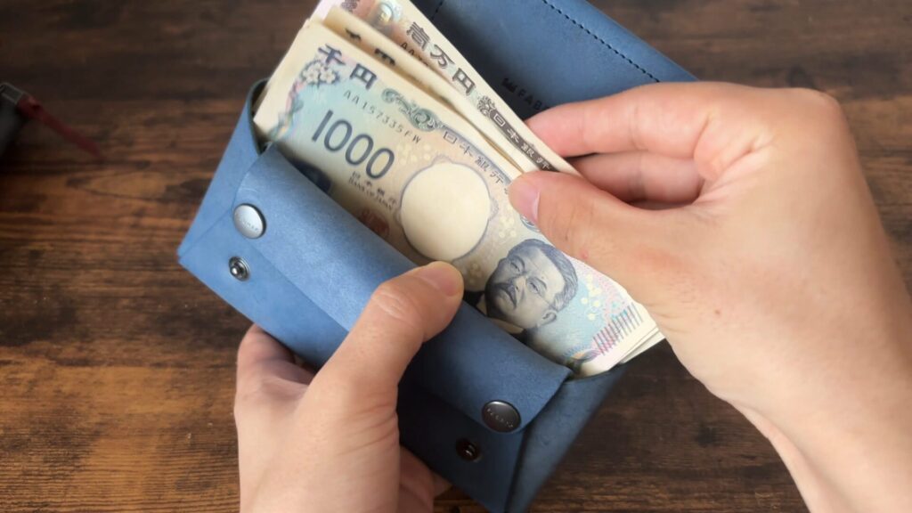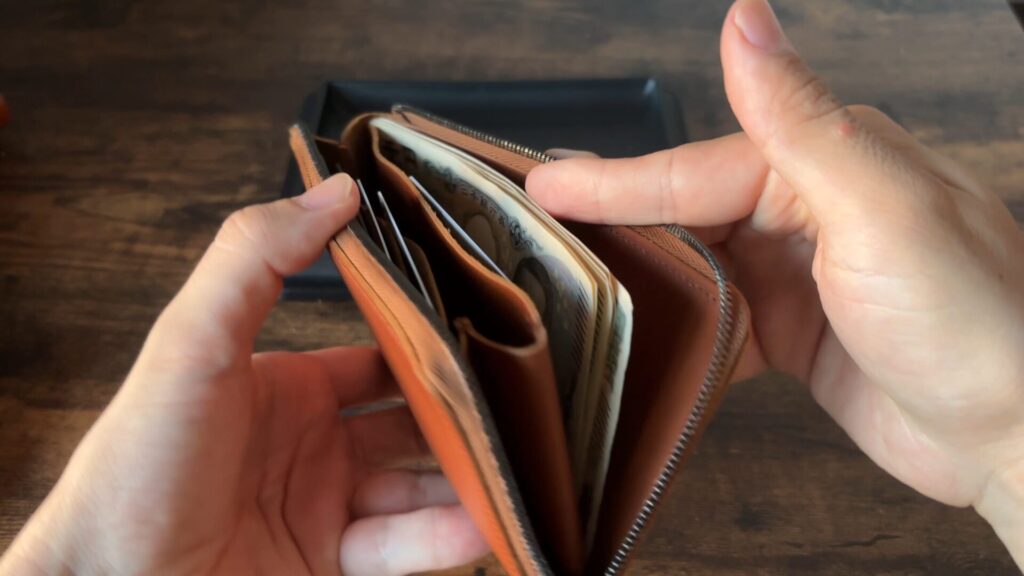 一万円札でもゆとりを持って収納可能。中で数えやすく、出し入れが非常にスムーズです。