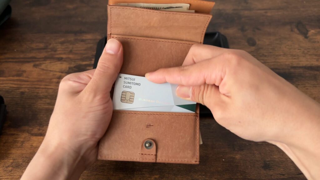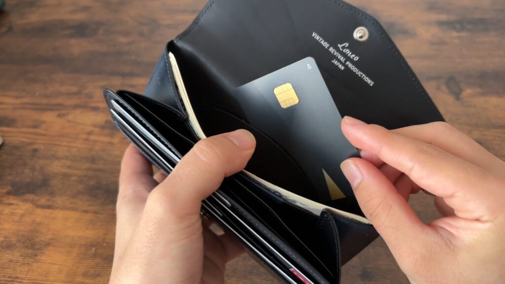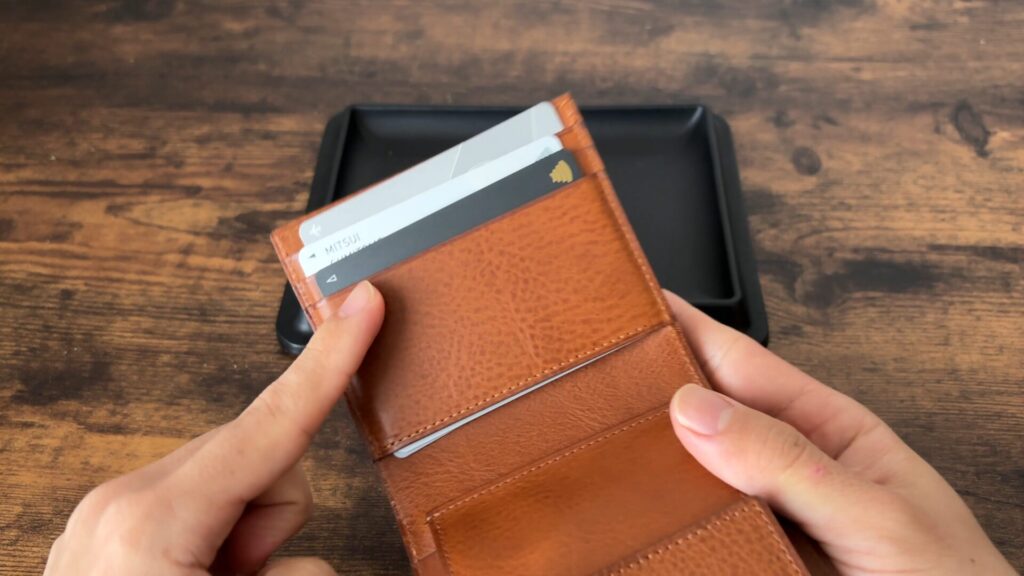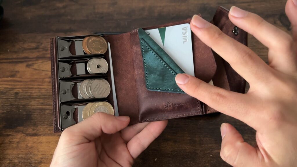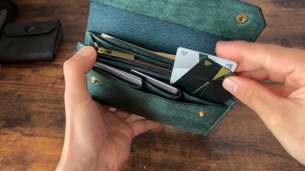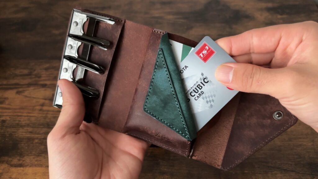 一番手前にはふわっと軽い力で取り出せる独自構造のカードポケット。4箇所に分かれているため視認性も十分で使いやすい。一番奥にカードポケットがついているため、ここにIC系のカードを入れてタッチ決済可能です。フリーポケットも近くにあるため、カードでさっと支払って領収書をスマートに収納できます。