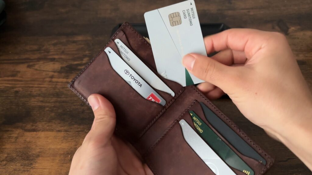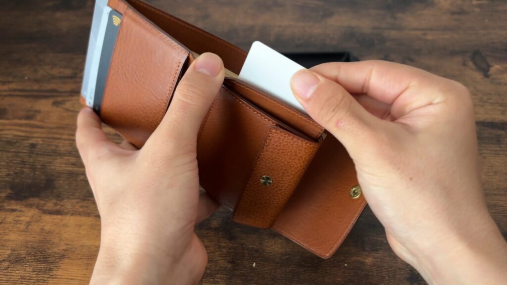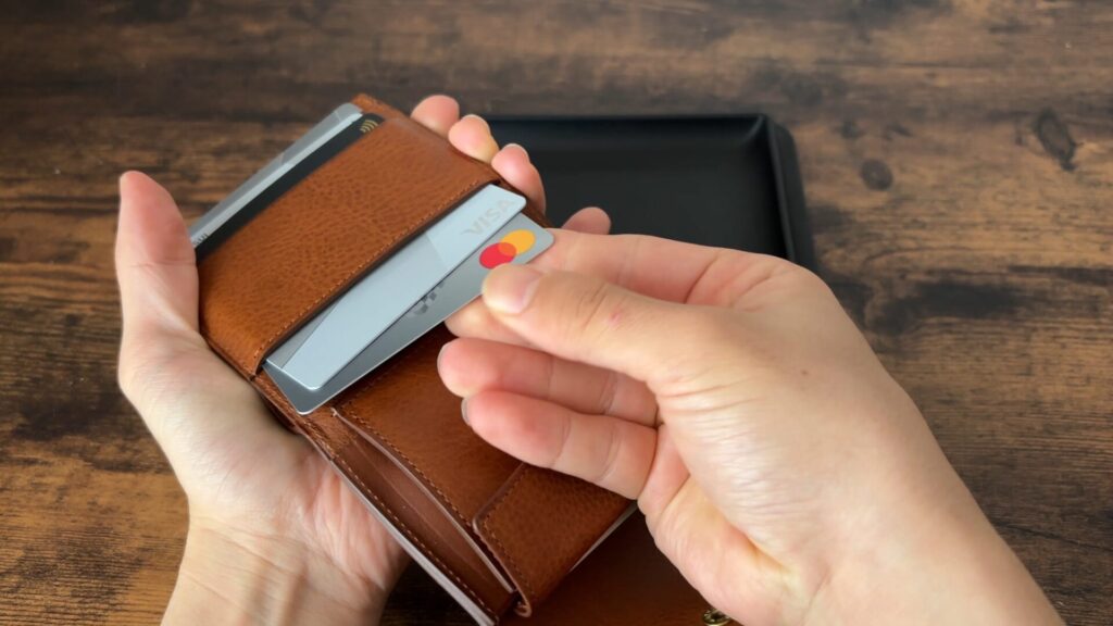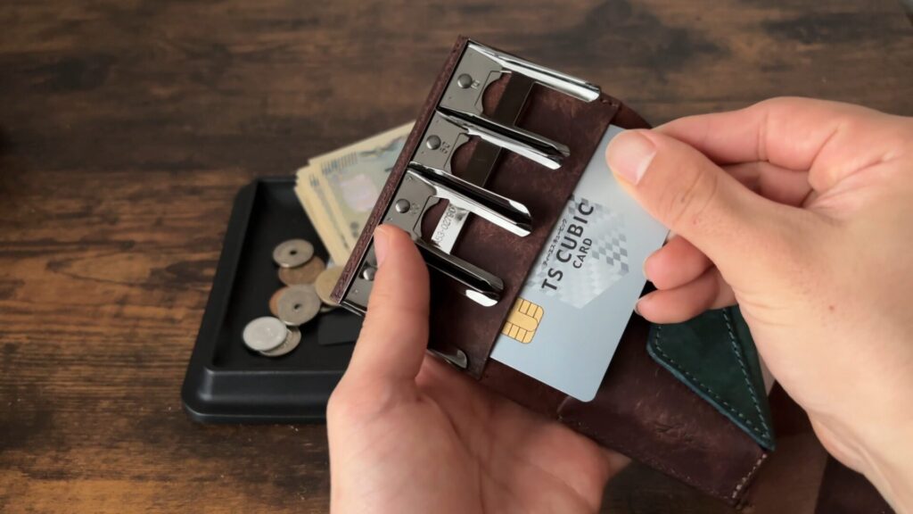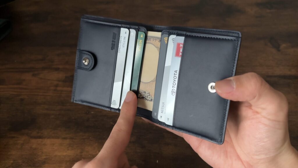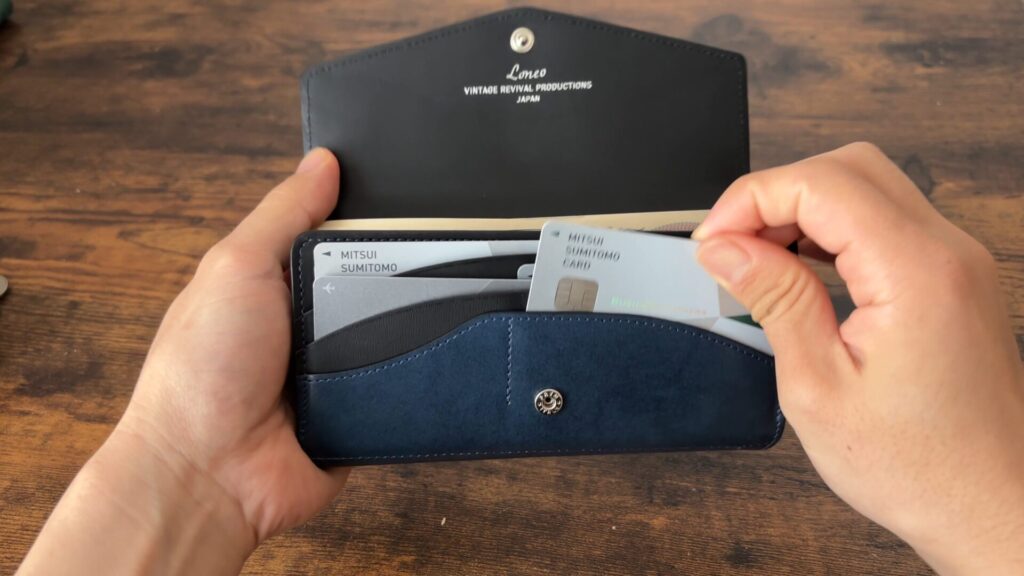 一番手前にはふわっと軽い力で取り出せる独自構造のカードポケット。4箇所に分かれているため視認性も十分で使いやすい。一番奥にカードポケットがついているため、ここにIC系のカードを入れてタッチ決済可能です。フリーポケットも近くにあるため、カードでさっと支払って領収書をスマートに収納できます。