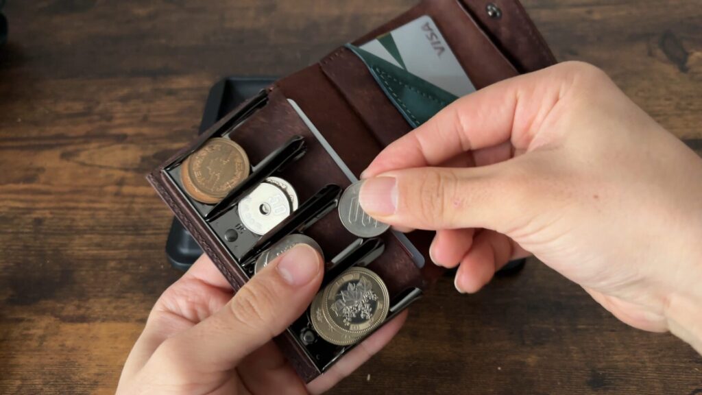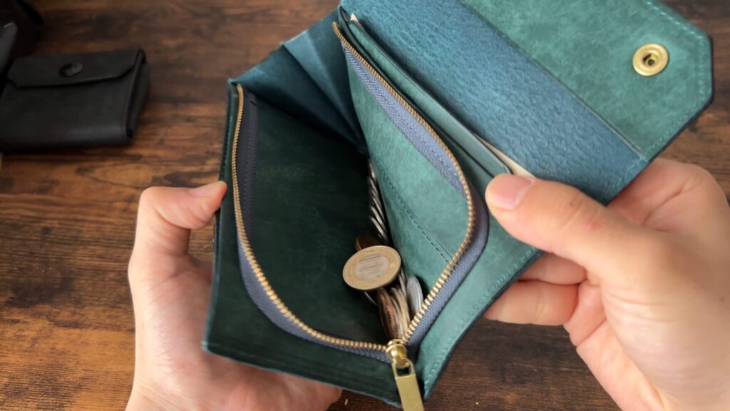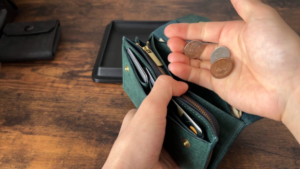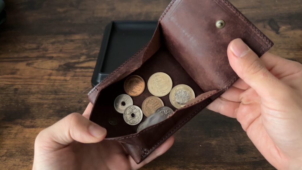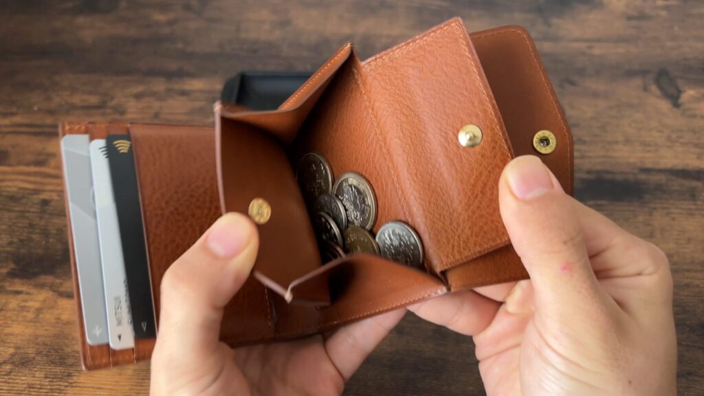 札入れは大きく開きクセもなく使いやすい。中で数えてスムーズに取り出せます。紙幣も小銭もカードも使いやすいシンプルな構造です。