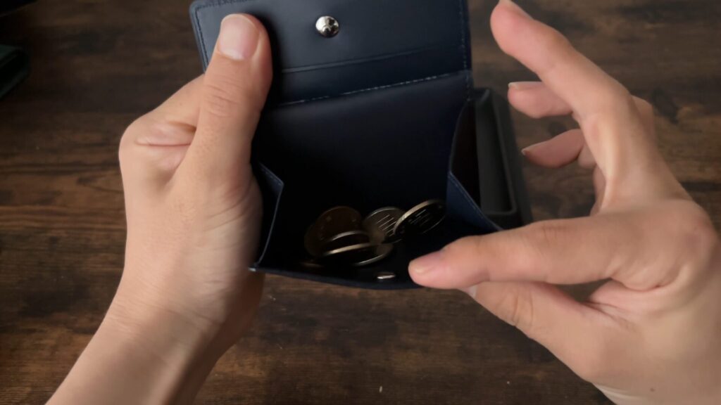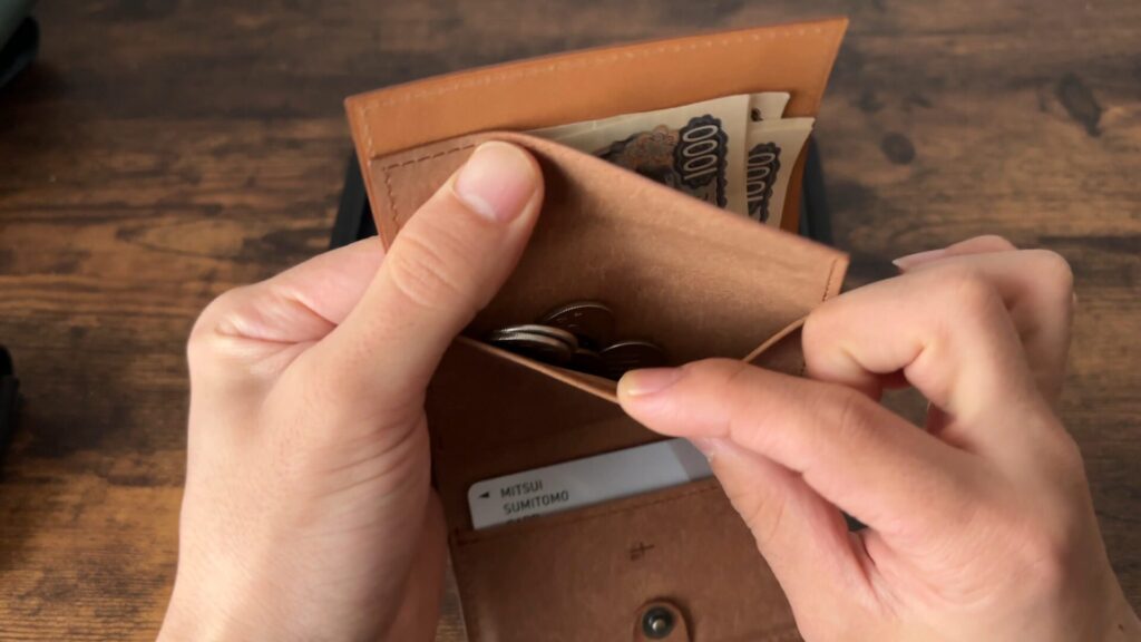ホック付きの蓋が付いていることで小銭の落下を気にせず安心して使えます。小銭も比較的大きく開いて出し入れがしやすい構造です。