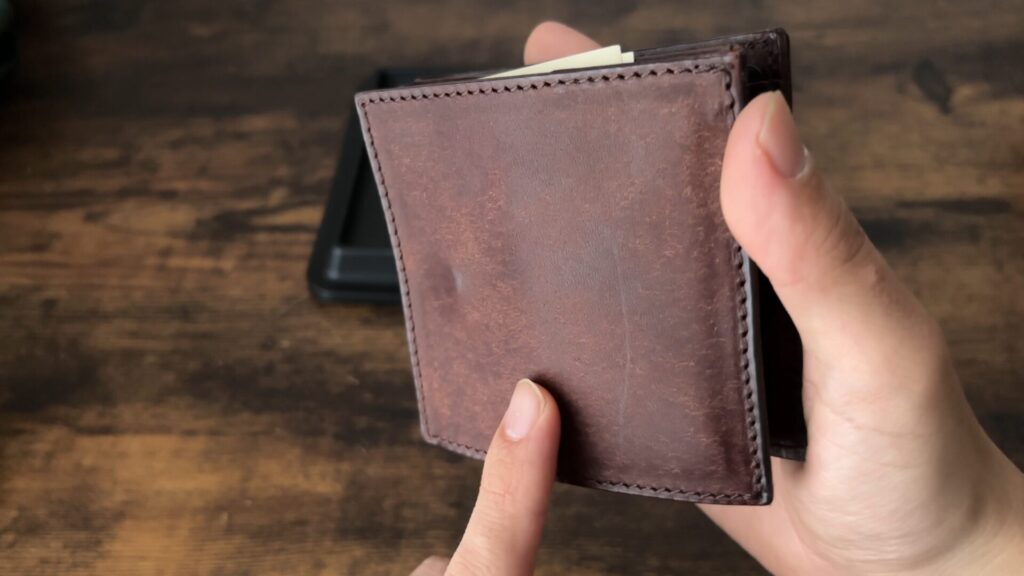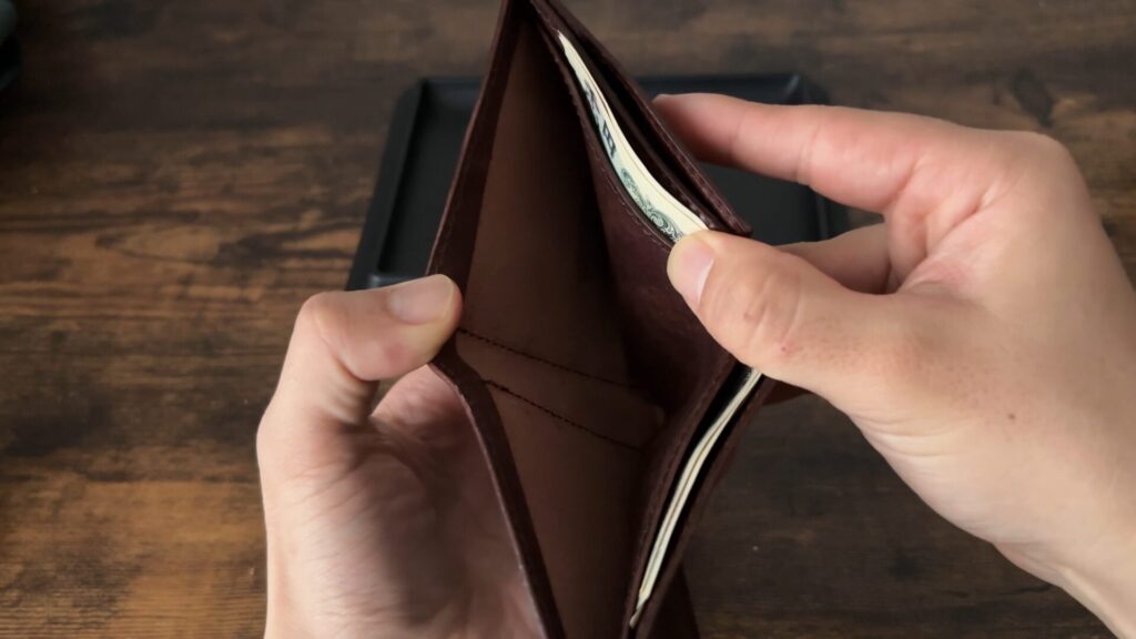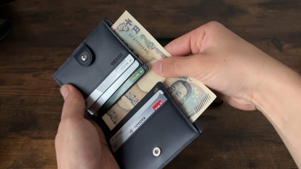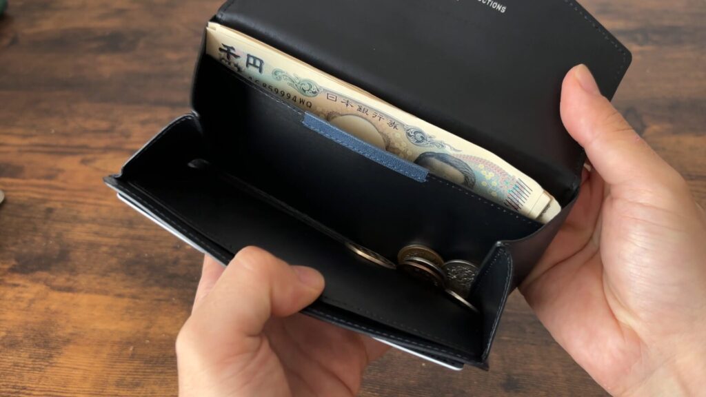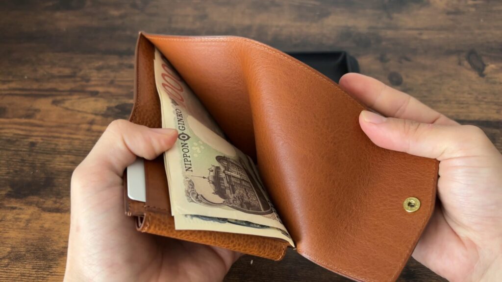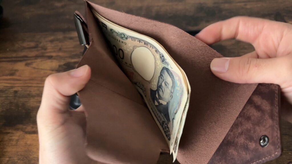 札入れは一万円札でもゆとりのあるサイズ。中で数えてスムーズに出し入れができます。通常使う10枚程度は問題なく収納可能です。