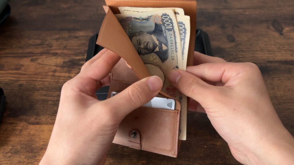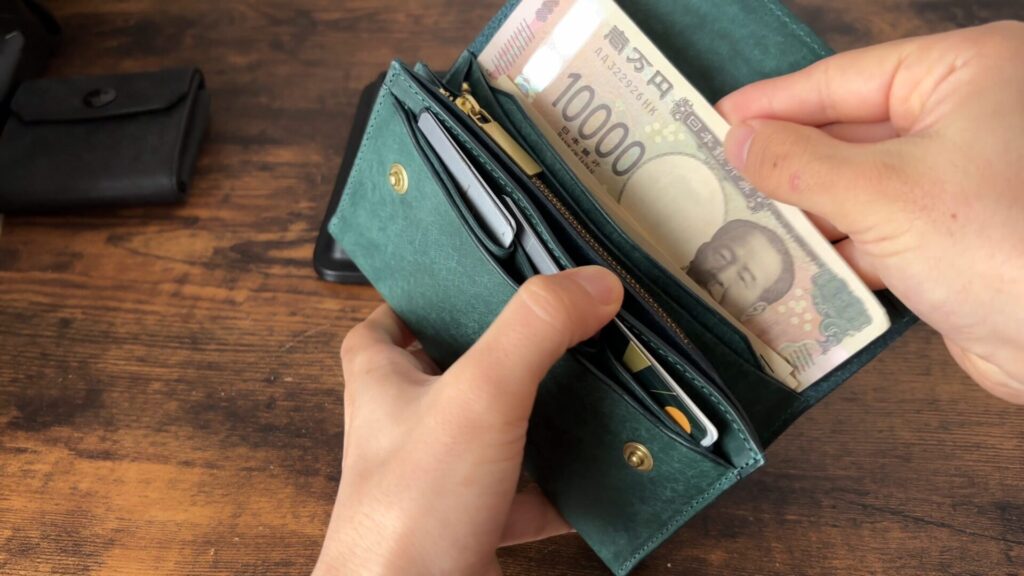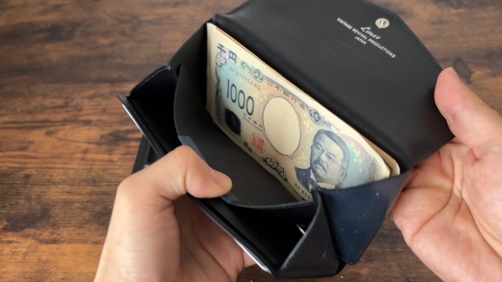 紙幣の収納は1箇所。小さい長財布ですが、一万円札でもゆとりを持って収納可能。中で数えて出し入れはかなりしやすく、現金払いもスムーズです。