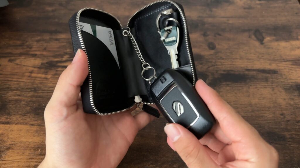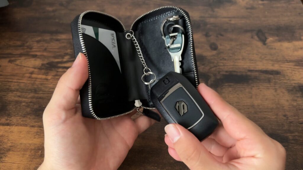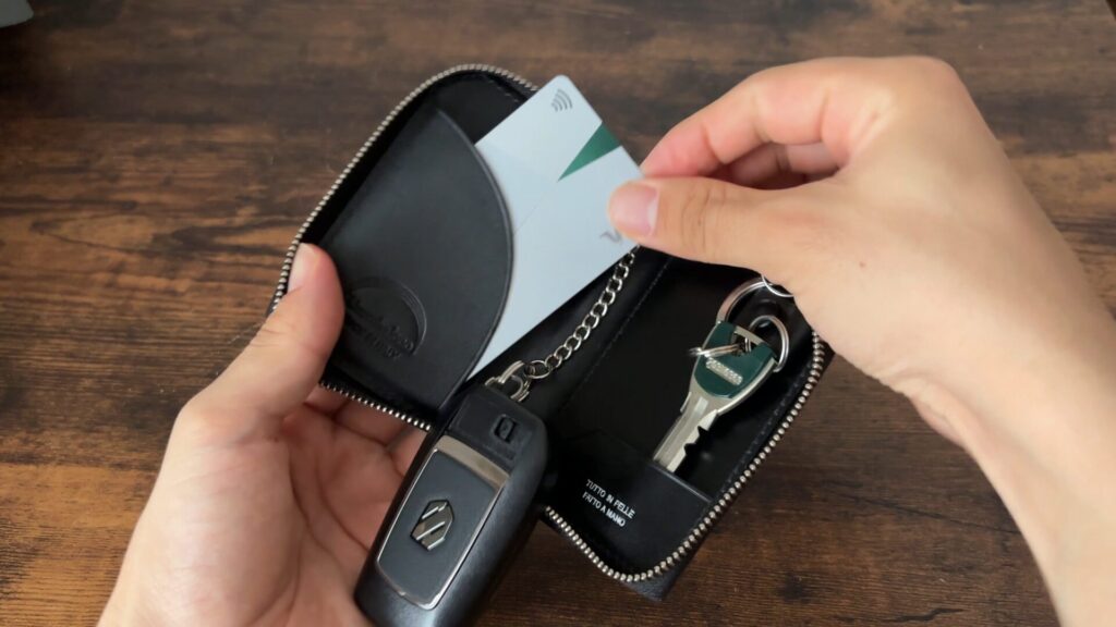 - 一括管理: スマートキー、免許証、駐車券、クレジットカードをまとめて収納