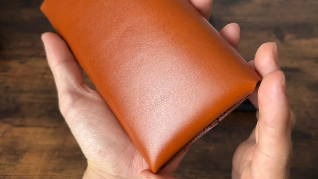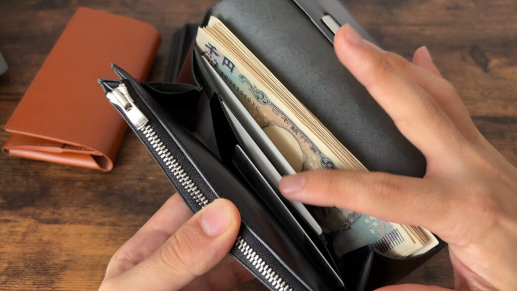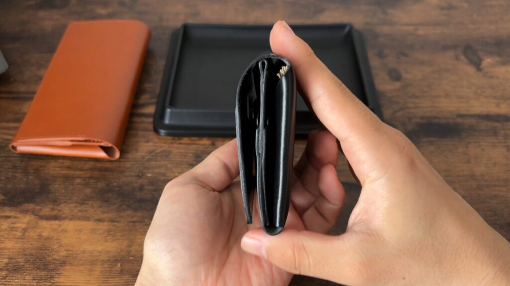 中身をしっかり入れても厚みはほとんど変わらず、ジャケットの内ポケットやバッグに入れてもシルエットを崩しません。